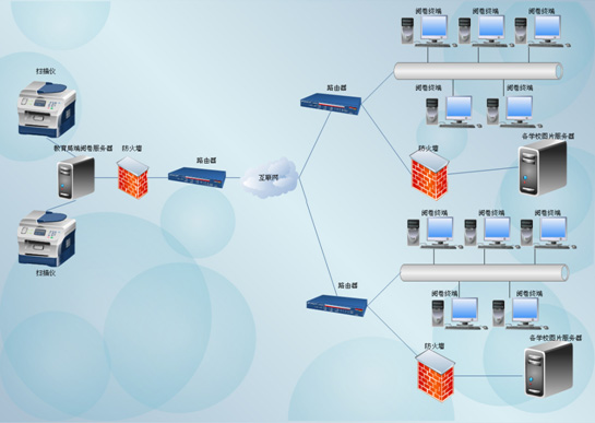 南昊網(wǎng)上閱卷互聯(lián)網(wǎng)應(yīng)用方案拓撲圖如下:
