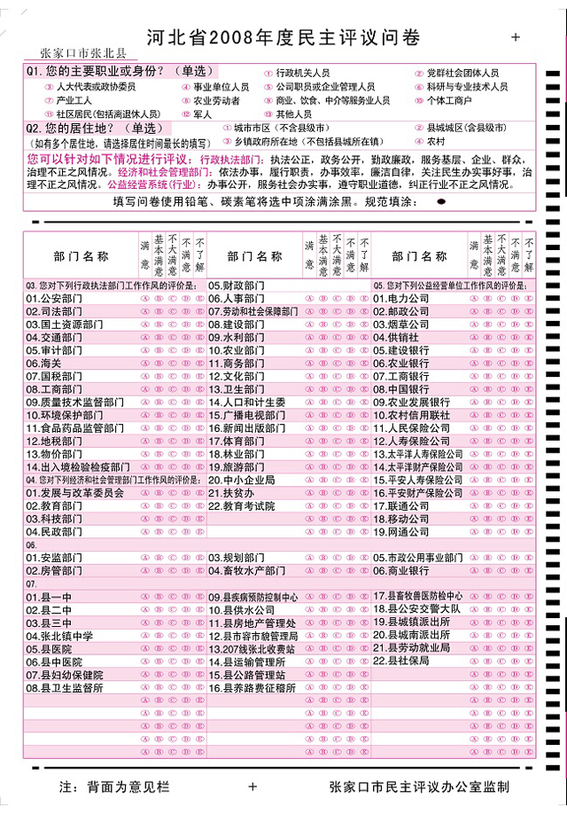 張家口張北縣2008年度民主評(píng)議問卷